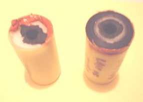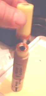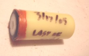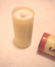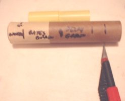 On flight day the touch hole is drilled. 2.5mm Drill just through the epoxy and yellow cap end to expose propellant. The delay can be shortened at this time by drilling deeper. For 1 second less delay drill approximately 2mm deeper into the propellant. Don't go too deep or you might turn the delay propellant into a cored grain under thrust. For delay changes more than 2 seconds less do this by adjusting the delay coring rod when pouring the delay grain.