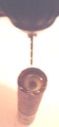 When epoxy is solid a 2.5 to 3mm drill bit is used to drill a center touch hole. I usually wait to do this step until launch day so I know I have a dry fresh contact to the ejection charge.