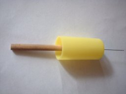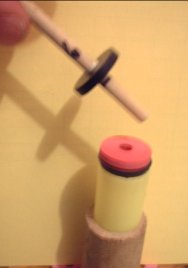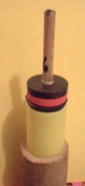Also note the pink plumbing washer that helps center the coring rod at the top while the needle in the bottom hole centers the bottom of the dowel.