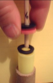 Push the dowel to the bottom. scrap any excess propellant overflow at the top and add the pink washer to center the top of the dowel.