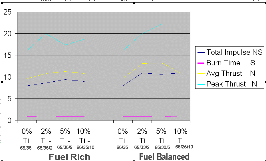 Fine Ti as an additive does seem to boost Total impulse for the same size of grain. I did not weigh the grains to determine ISP. While this would be interesting my main interest was performance within the same volume of propellant.