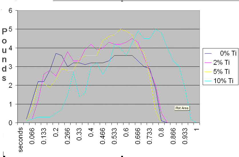 Looking at the last graph we can see that the higher percent Ti give the higher peak thrust when the formula is fuel/oxidizer balanced.