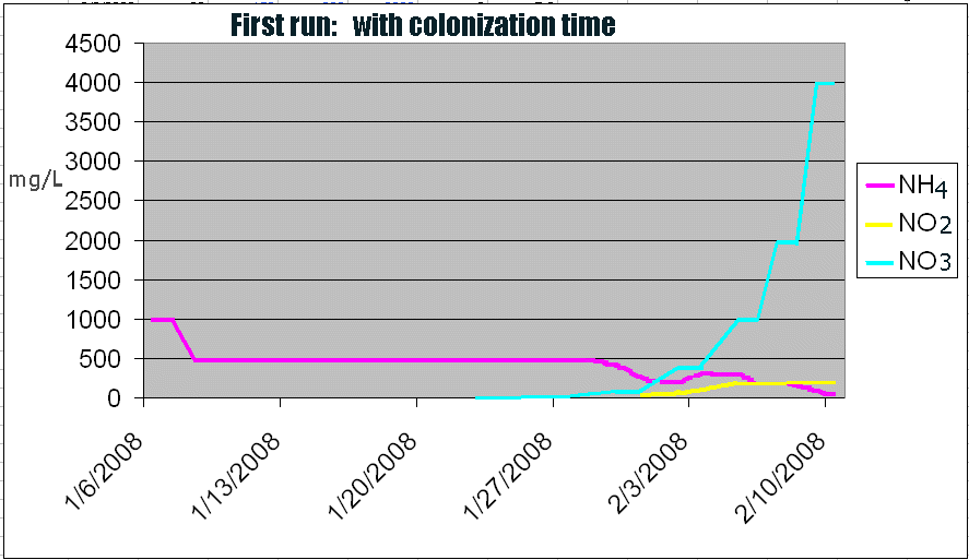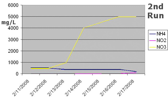 Now that the filter is colonized the second run with fresh media solution should respond faster The results above confirm this with most of the nitrate produced by the 4th to 5th day!.